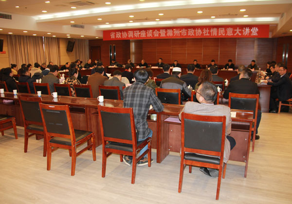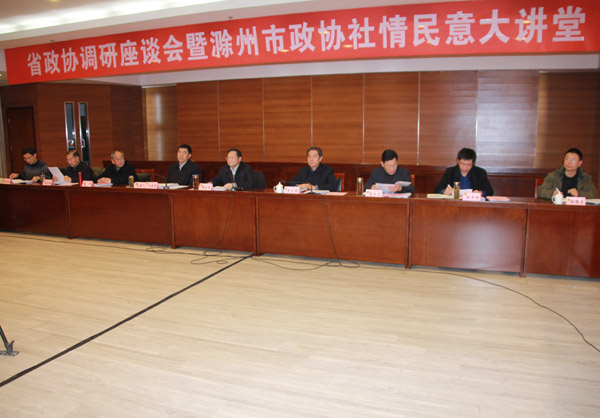 12月11日至13日,由省政协副主席郑永飞率队来天长市,围绕联系指导滁州市政协创新开办“社情民意大讲堂”开展专题调研活动。省政协经济委主任戴克柱参加调研,滁州市政协主席、市委秘书长汪建中, 滁州市政协副主席高怀忠、秘书长王小林,我市领导邓继敢、朱大纲、王献余、卢金堂、李宜祥陪同调研。